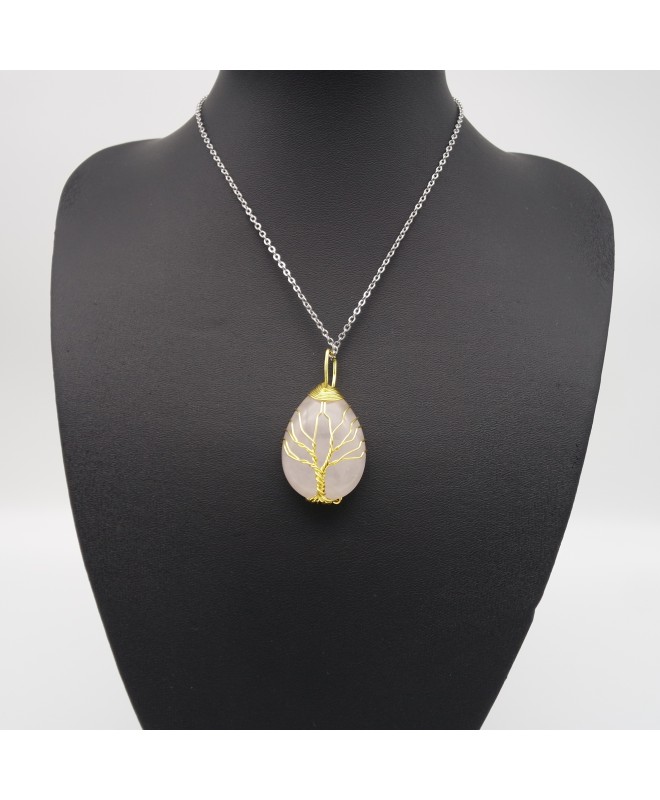 Rose Quartz Wrap-Around Teardrop-Shaped Natural Crystal Semi-Precious Stone Pendant Necklace